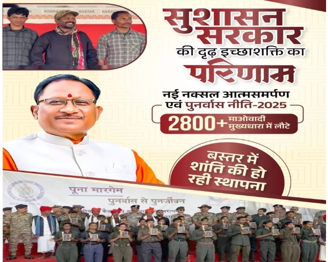 रायपुर। मुख्यमंत्री विष्णुदेव साय ने ट्वीट के माध्यम से बस्तर में सुशासन की निर्णायक नीतियों के प्रभाव की जानकारी साझा की है। उन्होंने कहा कि नक्सल आत्मसमर्पण एवं पुनर्वास नीति 2025 के अंतर्गत 2800 से अधिक लोगों ने हिंसा का रास्ता छोड़ते हुए मुख्यधारा में लौटकर विकास और विश्वास की