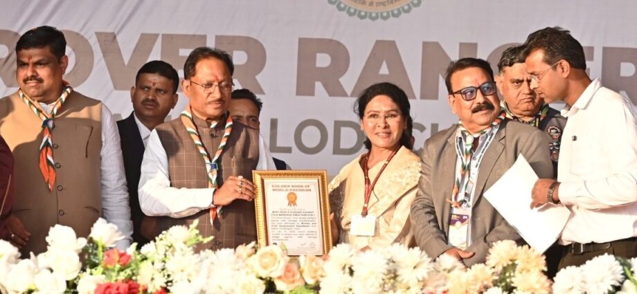 रायपुर: जिला मुख्यालय बालोद के समीप ग्राम दुधली में आयोजित देश की प्रथम राष्ट्रीय रोवर-रेंजर जंबूरी के समापन अवसर पर मुख्यमंत्री श्री विष्णु देव साय ने बाल विवाह जैसी सामाजिक कुरीति की रोकथाम के लिए जनभागीदारी सुनिश्चित करने के उद्देश्य से उपस्थित रोवर-रेंजरों, स्काउट-गाइड एवं जनसमुदाय को शपथ दिलाई। इस अवसर पर एक साथ 20 हजार से अधिक लोगों द्वारा बाल विवाह रोकथाम की शपथ लेकर गोल्डन बुक ऑफ वर्ल्ड रिकार्ड्स में बालोद जिले का नाम दर्ज कराया गया, जो बालोद जिले के लिए ऐतिहासिक उपलब्धि है।
