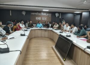 आज नगर पालिक निगम रायपुर की महापौर श्रीमती मीनल चौबे के निर्देशानुसार नगर निगम नगरीय नियोजन एवं भवन अनुज्ञा विभाग अध्यक्ष श्री मनोज वर्मा ने नगर निगम मुख्यालय महात्मा गांधी सदन के तृतीय तल सभाकक्ष में एएसपी यातायात श्री विवेक शुक्ला, नगर निवेशक श्री आभास मिश्रा, स्वास्थ्य अधिकारी डॉ. तृप्ति पाणीग्रही, उपायुक्त राजस्व श्रीमती जागृति साहू, जोन 2 जोन कमिश्नर श्री संतोष पाण्डेय, कार्यपालन अभियंता श्री आशुतोष सिंह, सहायक अभियंता श्री नीतीश झा सहित यातायात पुलिस नगर निगम नगर निवेश विभाग, जोन 2 नगर निगम बाजार विभाग के संबंधित अधिकारियों की उपस्थिति में साप्ताहिक मौदहापारा संडे बाजार में व्यवसाय करने वाले लगभग 100 फेरी वालो की बैठक ली। श्री मनोज वर्मा ने फेरी वालो को शहर हित में जनसुविधा की दृष्टि से मौदहापारा संडे बाजार की सुचारू व्यवस्था कायम करने रायपुर नगर पालिक निगम और यातायात पुलिस प्रशासन को सहयोग देने की अपील की।