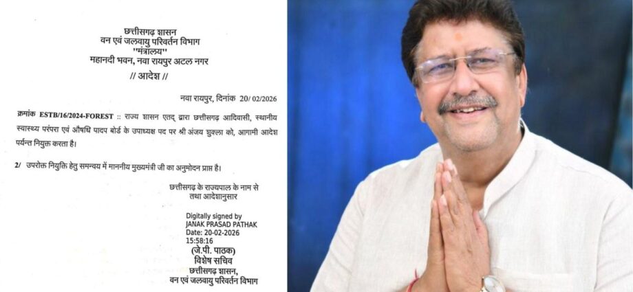 रायपुर। छत्तीसगढ़ सरकार ने छत्तीसगढ़ आदिवासी, स्थानीय स्वास्थ्य परंपरा एवं औषधि पादप बोर्ड के उपाध्यक्ष पद पर अंजय शुक्ला की नियुक्ति की है। यह नियुक्ति आगामी आदेश तक प्रभावशील रहेगी। इसका आदेश आज वन एवं जलवायु परिवर्तन विभाग के विशेष सचिव जेपी पाठक ने जारी किया है।