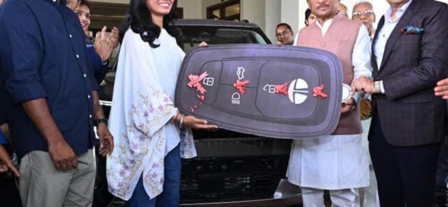 रायपुर। मुख्यमंत्री विष्णुदेव साय ने आज नवा रायपुर स्थित अपने निवास में आयोजित एक गरिमामय समारोह में भारतीय महिला क्रिकेट टीम की फिजियोथेरेपिस्ट और छत्तीसगढ़ की बेटी आकांक्षा सत्यवंशी को टाटा सिएरा कार उपहार स्वरूप प्रदान की। इस अवसर पर मुख्यमंत्री ने आकांक्षा को बधाई देते हुए कहा कि हमारी बेटियों ने विश्व कप जीतकर देश का गौरव बढ़ाया है। उन्होंने महिला क्रिकेट टीम के सम्मान और प्रोत्साहन के लिए टाटा मोटर्स द्वारा कार उपहार देने की इस पहल की सराहना की।