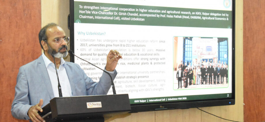 कृषि महाविद्यालय, इंदिरा गांधी कृषि विश्वविद्यालय, रायपुर में उज़्बेकिस्तान यात्रा के प्रमुख निष्कर्षों को साझा करने एवं अंतरराष्ट्रीय शैक्षणिक अवसरों को बढ़ावा देने के उद्देश्य से संगोष्ठी का आयोजन किया गया। यह कार्यक्रम विश्वविद्यालय के अंतरराष्ट्रीय शैक्षणिक सहयोग को सुदृढ़ करने के सतत प्रयासों का हिस्सा है।