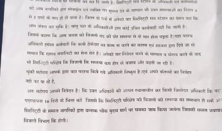 अतः महोदय आपसे निवेदन है कि उक्त अधिकारी को अन्यत स्थानान्त्रीत कर किसी जिम्मेदार अधिकारी कि यहा पदस्थापना 10 दिनों के भितर करें जिससे कि सिरगिट्टी परिक्षेत्र की बिजली की समस्या का समाधान हो सके अ सिरगिट्टी के समस्त नागरिकों द्वारा बन्नाक चौक मुख्य मार्ग पर चक्का जाम किया जायेगा जिसकी समस्त जवाब बिजली विभाग कि होगी।” वीडियो