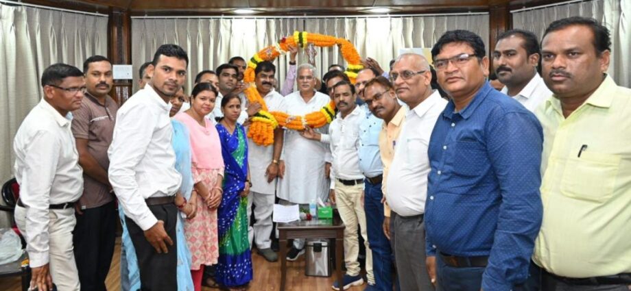 रायपुर / मुख्यमंत्री श्री भूपेश बघेल से आज यहां उनके निवास कार्यालय में छत्तीसगढ़ संयुक्त शिक्षक संघ के प्रतिनिधिमंडल ने सौजन्य मुलाकात की। प्रतिनिधिमंडल ने शासकीय कर्मचारियों के हित में लिए गए फैसलों के लिए मुख्यमंत्री श्री बघेल को गजमाला पहनाकर उनका आभार जताया। प्रतिनिधिमंडल ने कहा कि केंद्र के समान डीए और गृह भाड़ा वृद्धि सहित सभी फैसले कर्मचारी हित में ऐतिहासिक हैं। इन सौगातों से प्रदेश भर के शिक्षकों सहित सभी कर्मचारियों में हर्षाेल्लास की लहर है। इस अवसर पर छत्तीसगढ़ संयुक्त शिक्षक महासंघ के अध्यक्ष श्री राजनारायण द्विवेदी, श्री कृष्ण कुमार नवरंग, श्री भूपेंद्र सिंह बनाफर, श्री शंकर साहू, श्री शिव सारथी, श्री विक्रम राय, श्री धर्मदास बंजारे, श्री चेतन कुमार बघेल, श्री कमल दास मुरचले सहित अन्य लोग उपस्थित रहे।