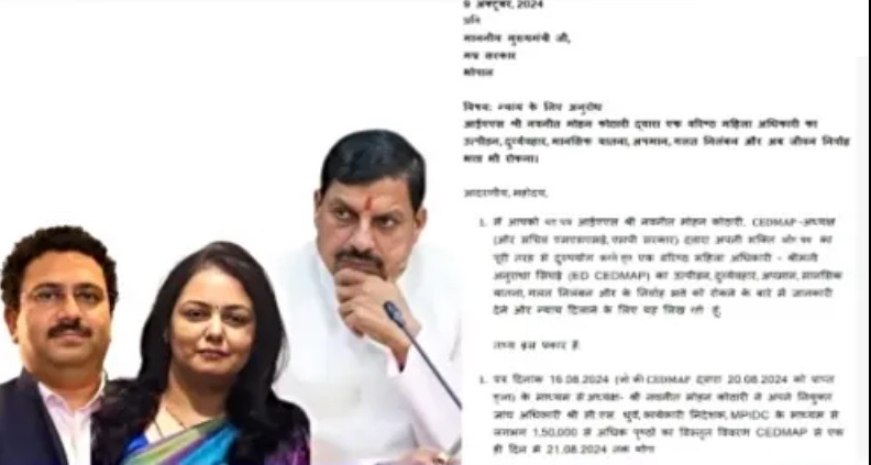 भोपाल। मध्य प्रदेश में बीतें दिनों से एक मामला काफी गरमाया हुआ हैं। बता दें कि महिला अधिकारी अनुराधा सिंघई (ईडी सेडमैप) ने आईएएस नवनीत मोहन कोठारी पर कई तरह के आरोप लगाए हैं। वहीं इन आरोपों को लेकर मुख्यमंत्री मोहन यादव को पत्र भी लिखा हैं।