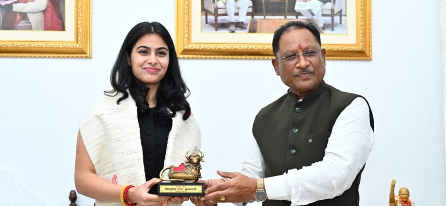 रायपुर। छत्तीसगढ़ के मुख्यमंत्री विष्णुदेव साय से आज उनके निवास में पेरिस ओलम्पिक 2024 में कांस्य पदक विजेता निशानेबाज मनु भाकर ने मुलाकात की। मुख्यमंत्री साय ने मनु भाकर का छत्तीसगढ़ में स्वागत करते हुए कहा कि, आपकी उपलब्धि से पूरा देश गौरवान्वित हुआ है। बता दें कि, मनु भाकर राजधानी रायपुर में आयोजित 27वीं अखिल भारतीय वन खेलकूद प्रतियोगिता के समापन समारोह में हिस्सा लेने छत्तीसगढ़ आयी हैं।
